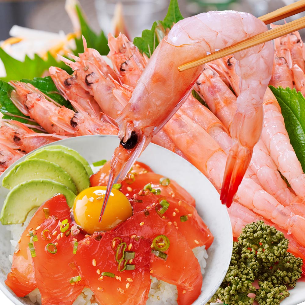 鹿児島県産黒毛和牛切り落とし180g、鹿児島県産(黒豚バラスライス180g、赤身スライス180g)、(ゆず香リ焼タタキ、ガーリック鰹タタキ)合計350g、枕崎産天然特大タカエビ1箱、まぐろ丼90g×2P
