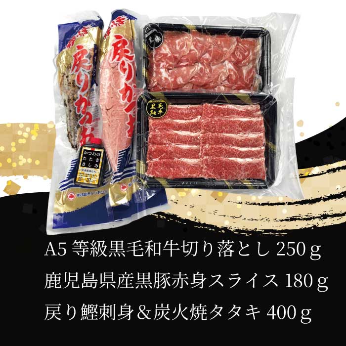 A5等級黒毛和牛切り落とし250g、鹿児島県産黒豚赤身スライス180g、戻り鰹(刺身&タタキ)400g、生姜タレ 85g